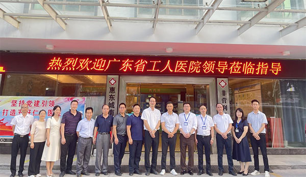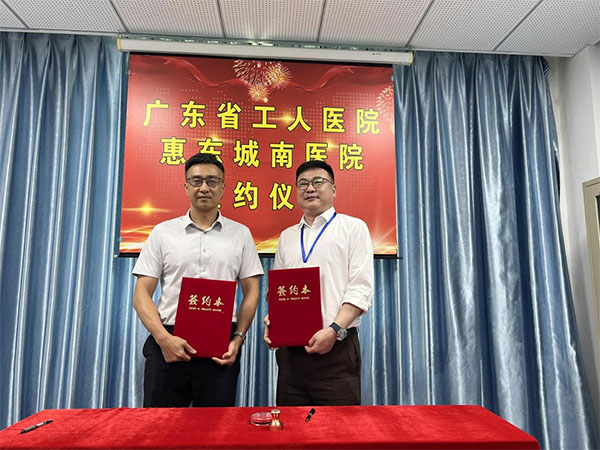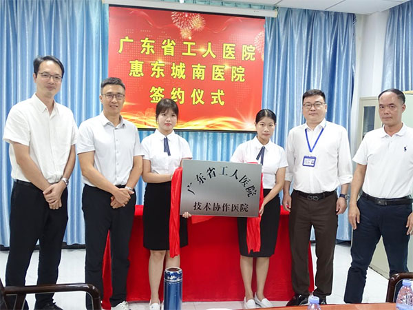 9月2日至3日广东省工人医院、惠东城南医院在惠东县签署医疗技术合作协议并举行“广东省工人医院技术协作医院”揭牌仪式。广东省工人医院党委书记、院长黄刚、党委副书记谢锐君,广东劳模疗休养基地总经理潘文光,惠东城南医院院长原浩锋及相关科室负责人参加交流活动和签约仪式。